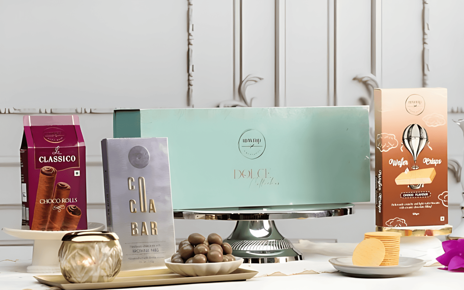 A thoughtfully curated selection of gourmet wafers, rich cocoa bar, crunchy dragees, and classic bites, elegantly presented in the signature Dolce Collection box—ideal for premium festive gifting.