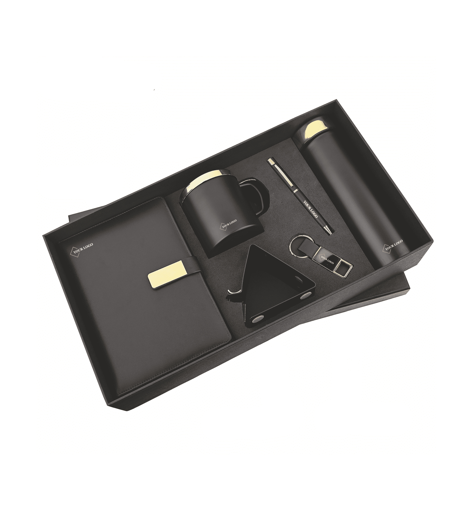 This elegant 6-in-1 executive gift set is crafted for impact and functionality, featuring a luxurious black and gold theme that commands attention. Designed for high-end corporate gifting, leadership appreciation, onboarding kits, or client giveaways, this box is as practical as it is prestigious. This set includes: