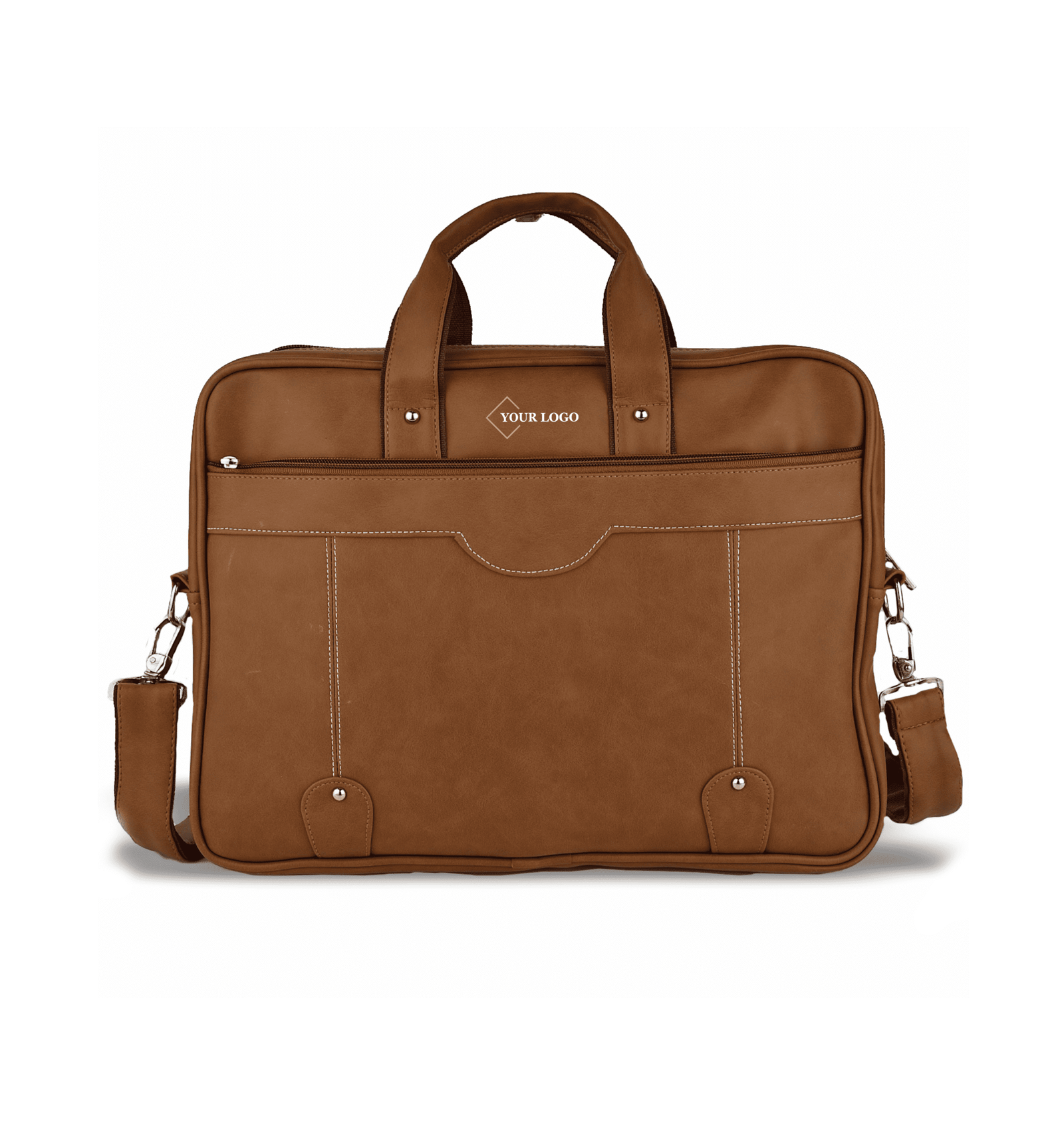 The Premium Brown Leatherette Office Bag blends classic design with modern business utility. Made from high-quality tan leatherette, it features dual handles and a detachable shoulder strap for versatile carrying. A sleek exterior pocket with white contrast stitching adds charm while offering easy access to frequently used items. The bag is spacious enough for laptops up to 15.6 inches, with a padded compartment and organized sections inside for documents, chargers, and accessories.