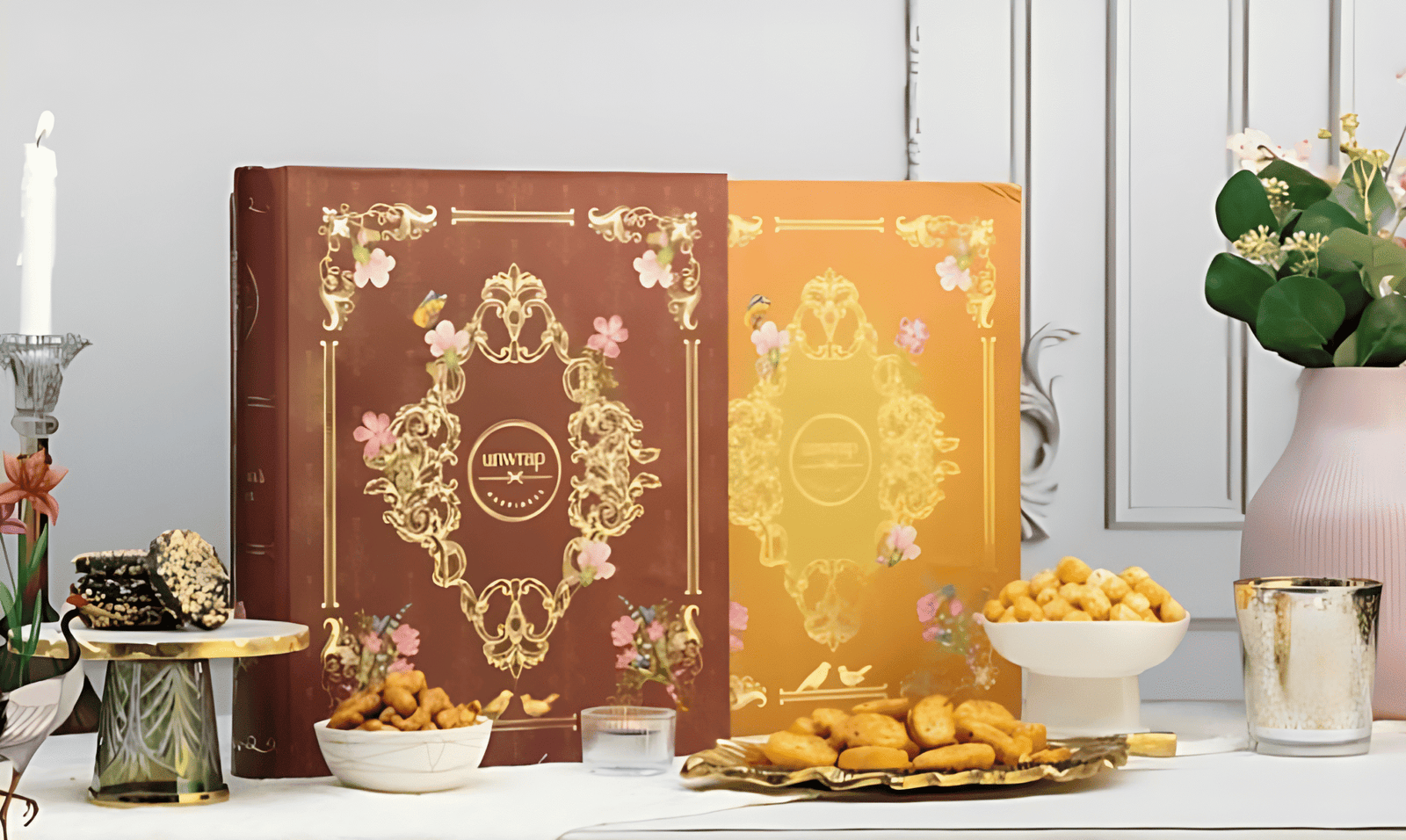 A regal gift box with ornate golden designs, filled with an assortment of brittles, nuts, and gourmet savories—perfect for festive celebrations and luxury gifting.